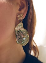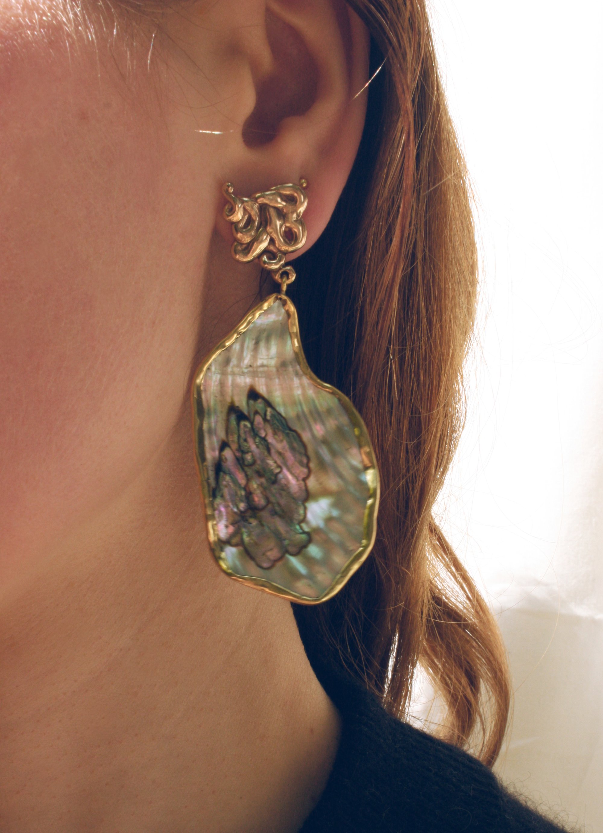 Handcut abalone shell in a brass setting featuring two different bronze whirl cloud studs.