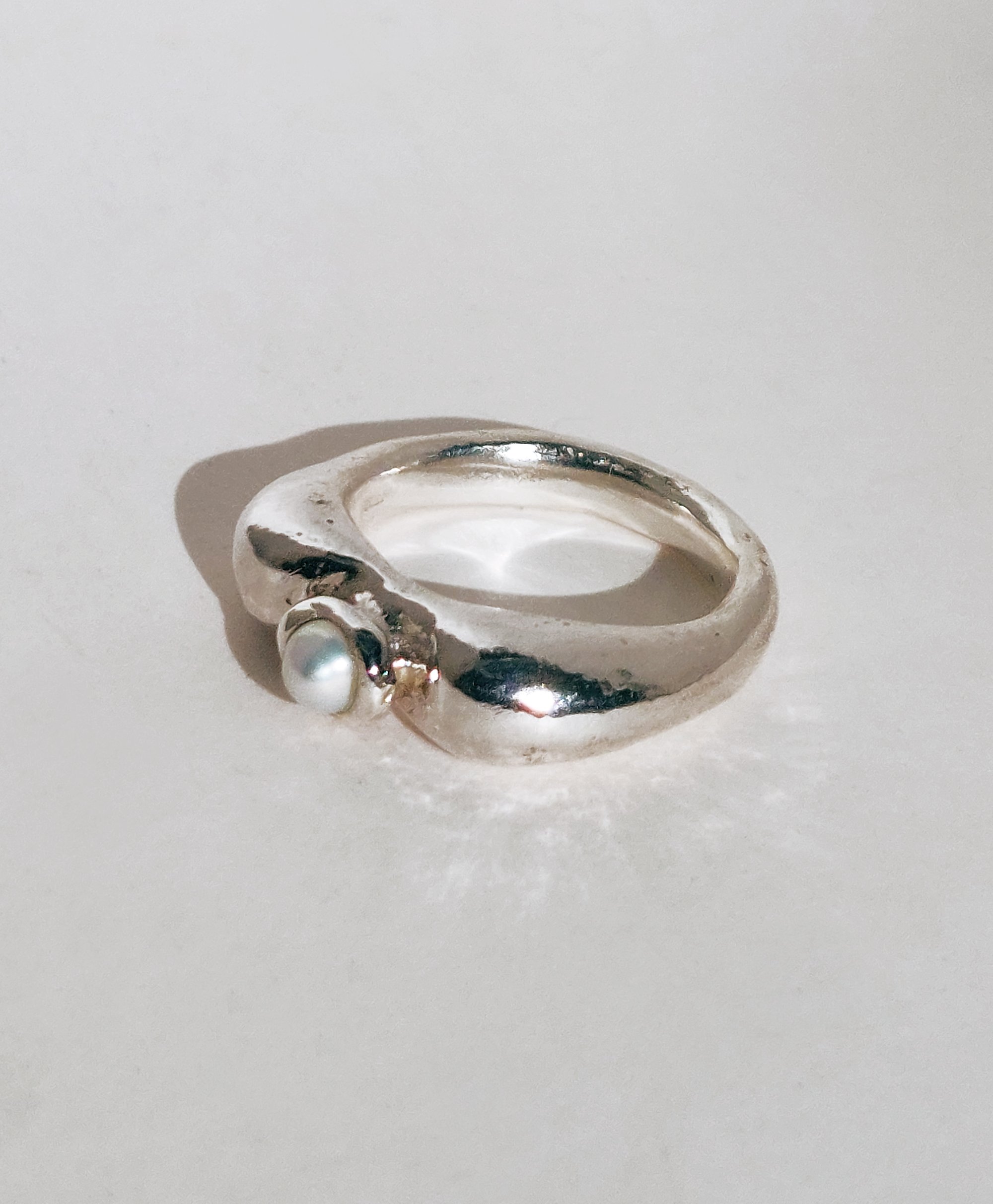 A hand sculpted ring resembling a heart shaped bottle, featuring a small freshwater pearl. Made using the sand casting technique in sterling silver with a slightly textured surface.