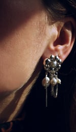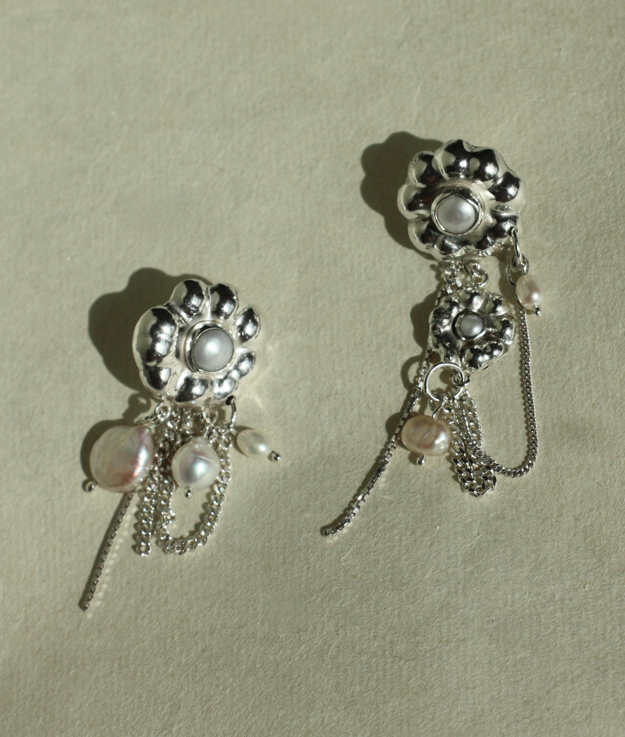Asymmetrical pair of forged flower earrings made in recycled sterling silver featuring a variety of freshwater pearls dangling between playful chains. The chains are attached to the back of the stud for a playful effect around the lobe.