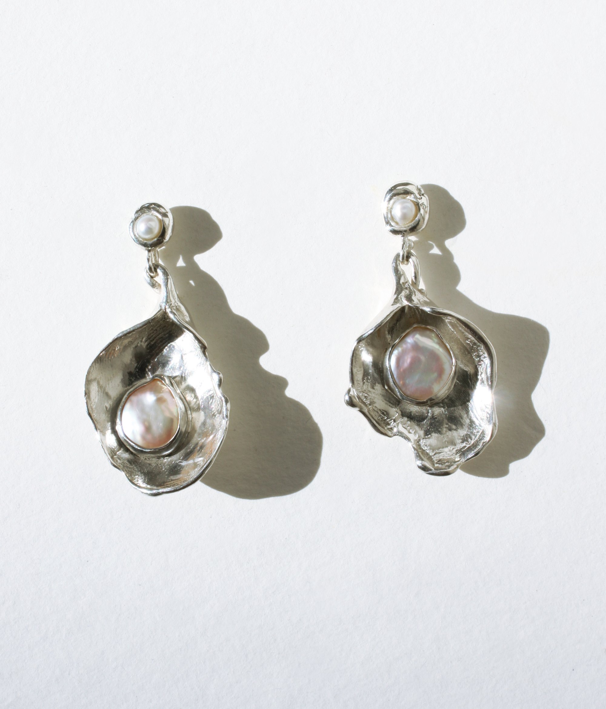 These silver oysters are bold and playful, featuring freshwater pearls of silvery pink iridescence nestled in the center and two round white pearls op top.