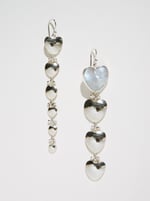 Playful and elegantly moving mix-matched heart chain earrings in sterling silver featuring a mother of pearl heart.
