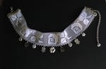 Choker necklace featuring a vintage lace ribbon, sterling silver flower charms and hand carved mother of pearl black and white tulips.
