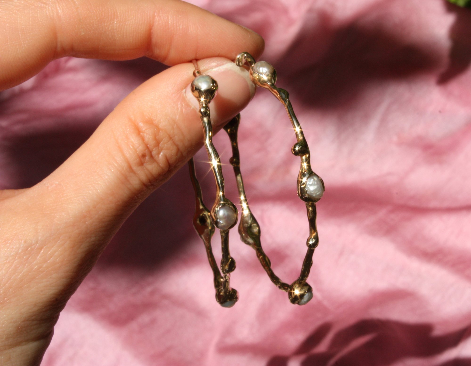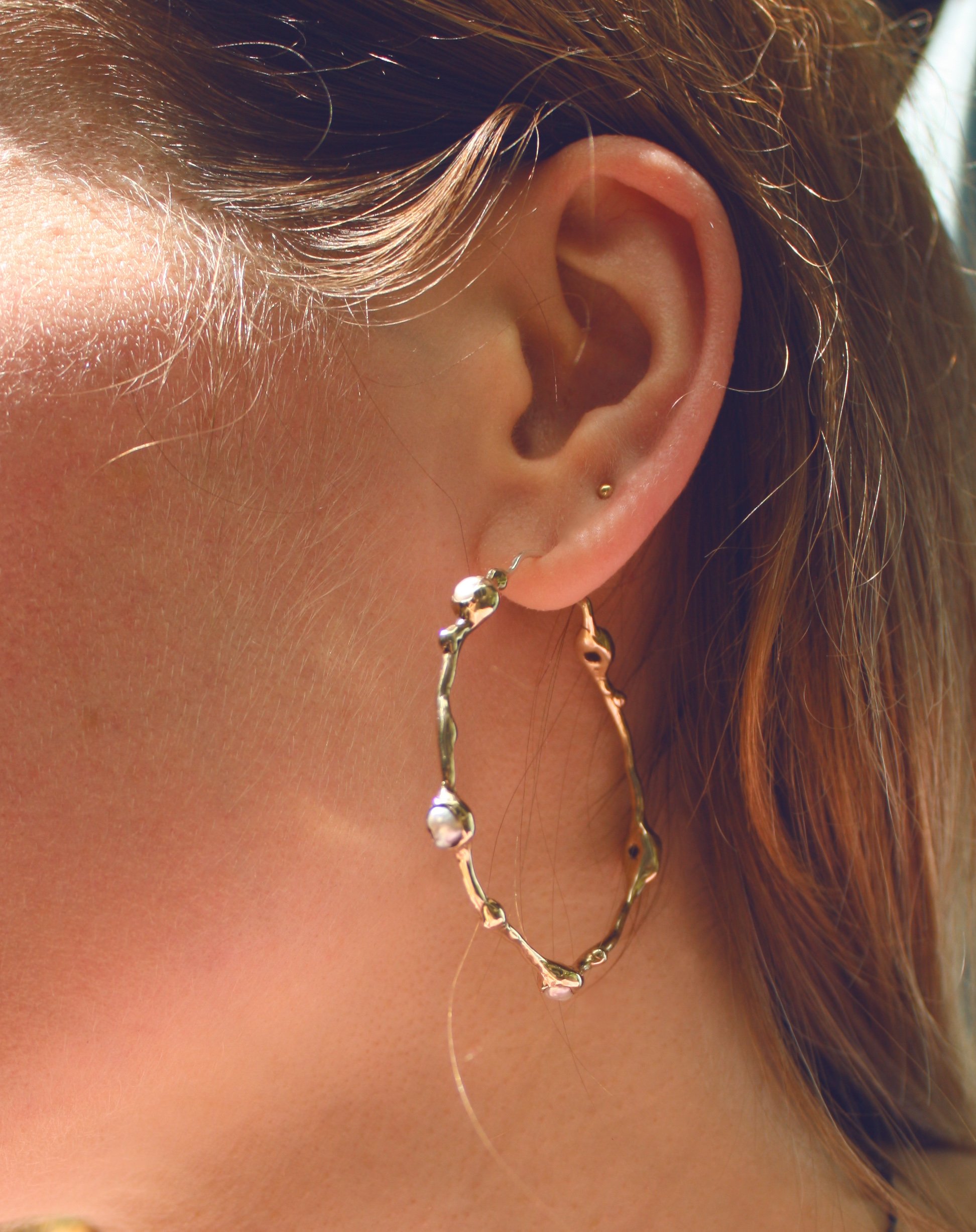 Dreamy hoops in bronze featuring small irregular rice pearls,