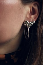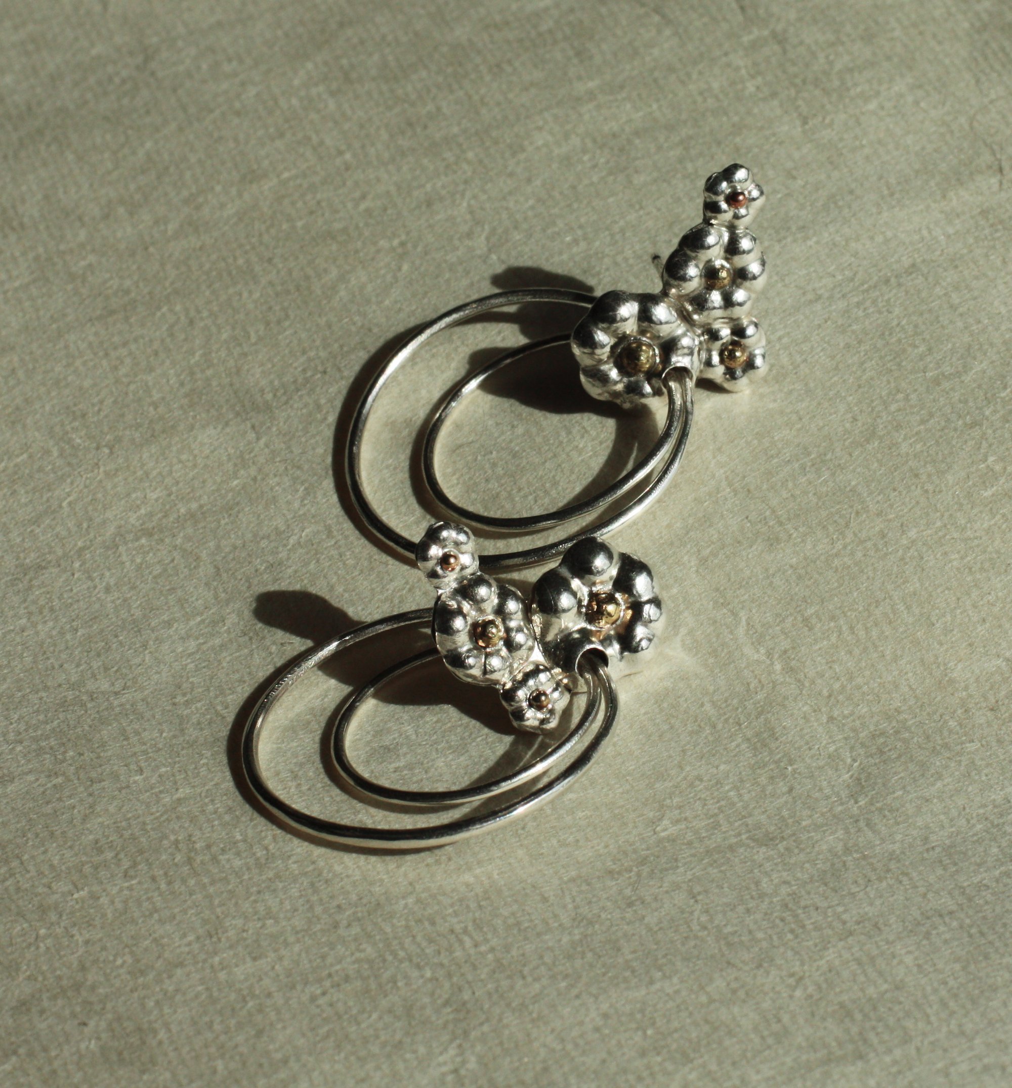 A delicate bunch of forged flowers made in recycled sterling silver featuring brass dots and two dangling, irregular silver hoops. The flowers are clustered along the earlobe while the hoops add some elegant playfulness. Lightweight and comfortable to wear.