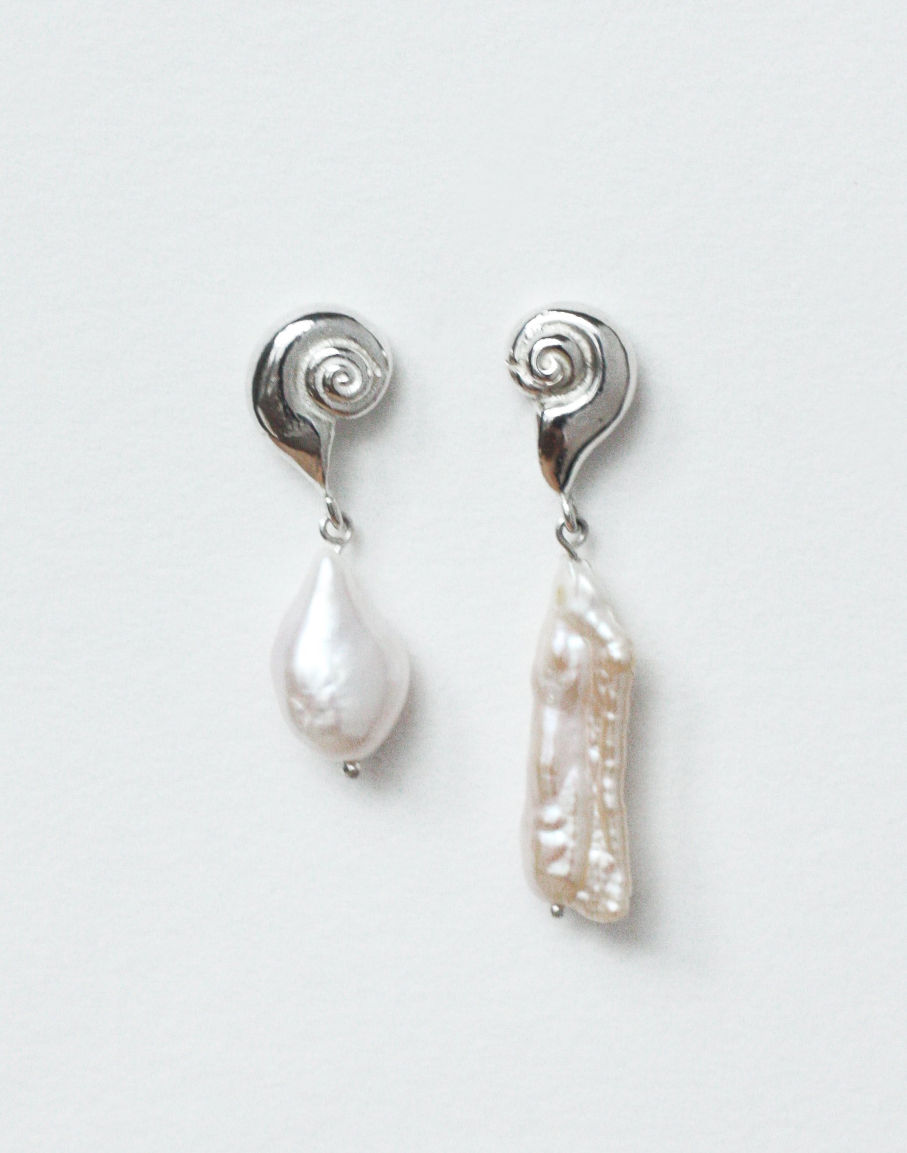 Snail shell stud earrings carved in sterling silver featuring two irregularly matched lustrous baroque freshwater pearls.