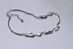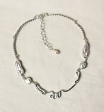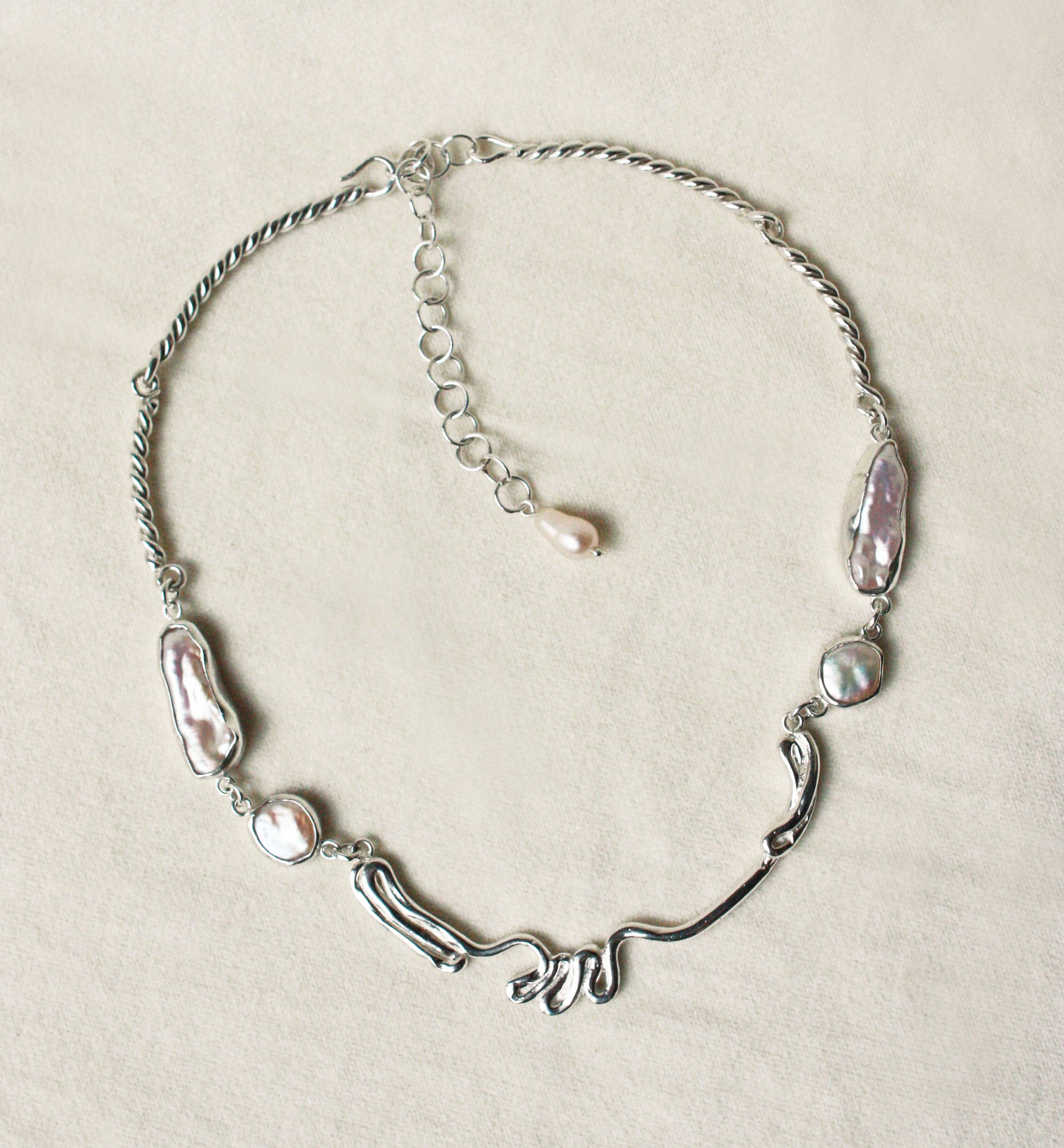 Made from recycled silver, this special design consists of curvy and twisted elements along with baroque and keshi pearl beads, linked with silver jump rings. An extended chain length is added to the clasp closure topped with a dangling freshwater pearl, making it a versatile necklace which can be either worn as a choker or a collier.